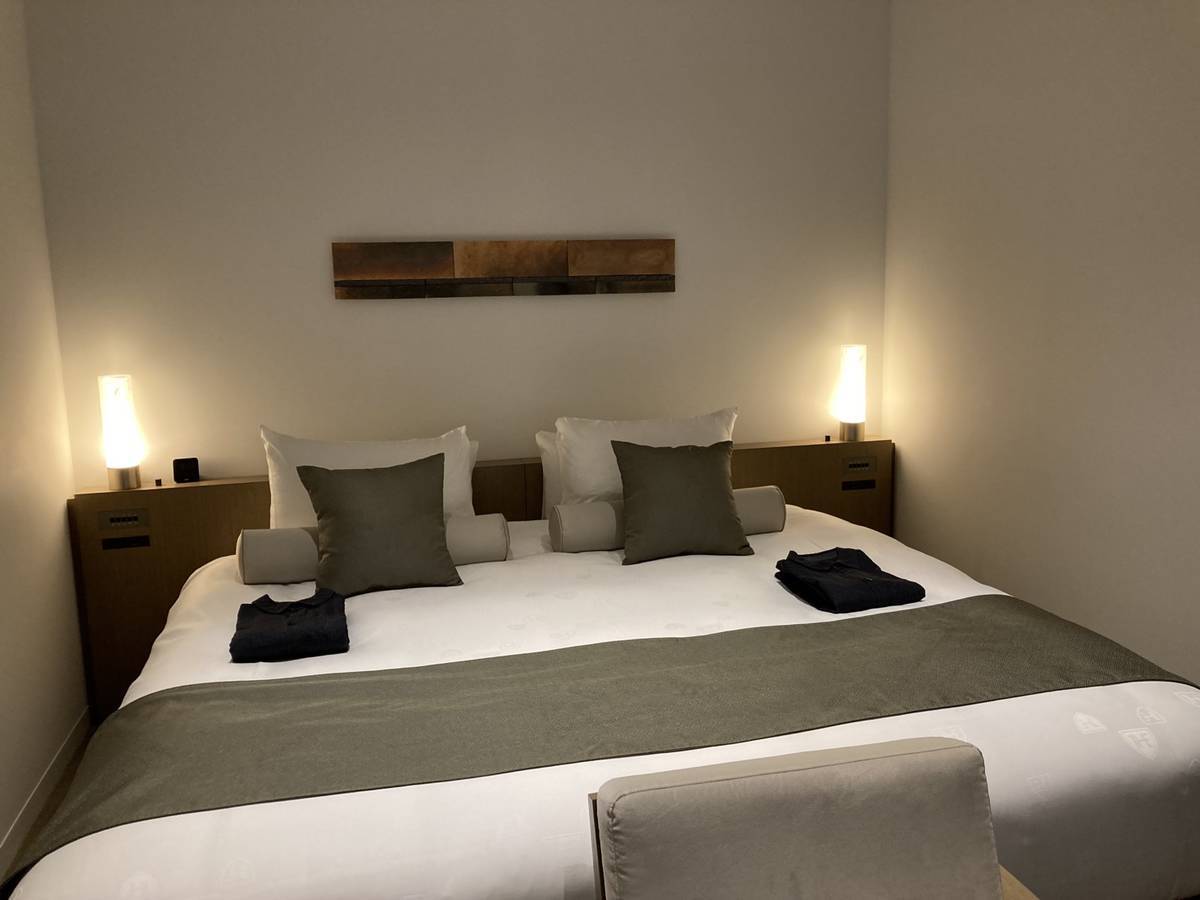 ベッドはキングサイズで広々。でも貧乏性なもので落ち着かず、片側の布団だけめくって端っこで寝ました。