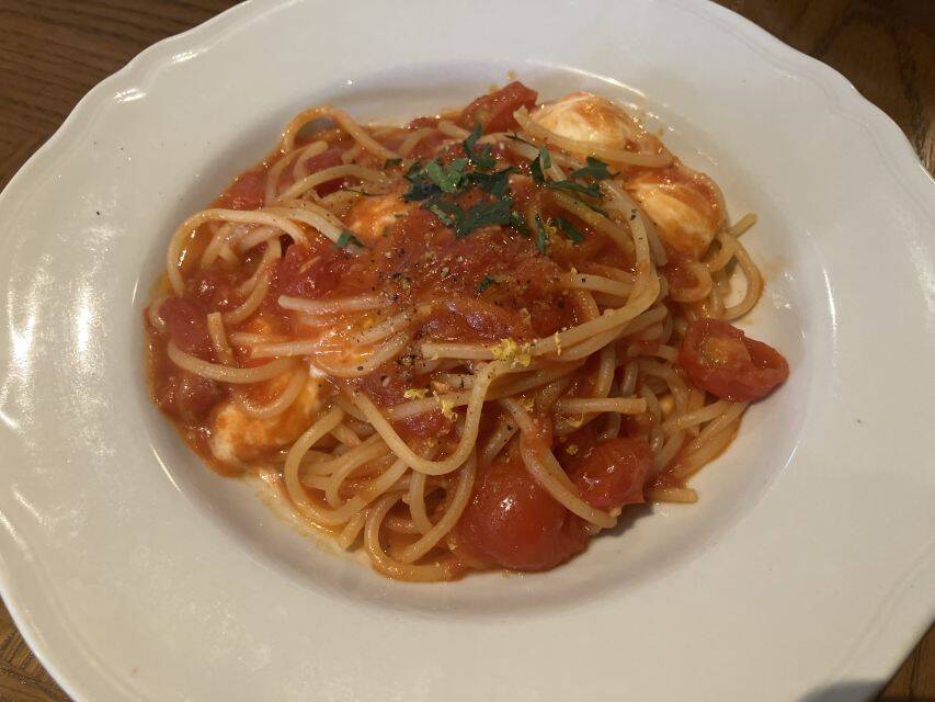 オタク母が頼んだのは「チェリートマトとストラッチャテッラ ポモドーロ」。ストラッチャテッラとはチーズの一種、だそうです。